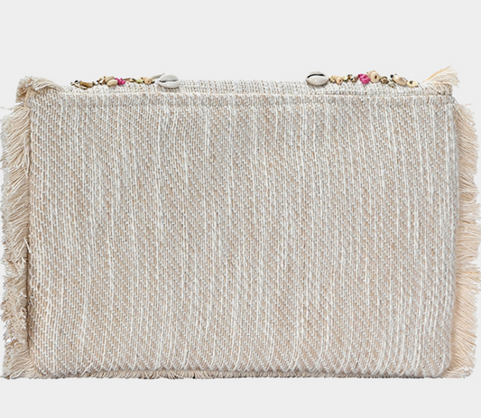 Puka Shell Embroidered Aztec Fringe Detail Jute Clutch Bag