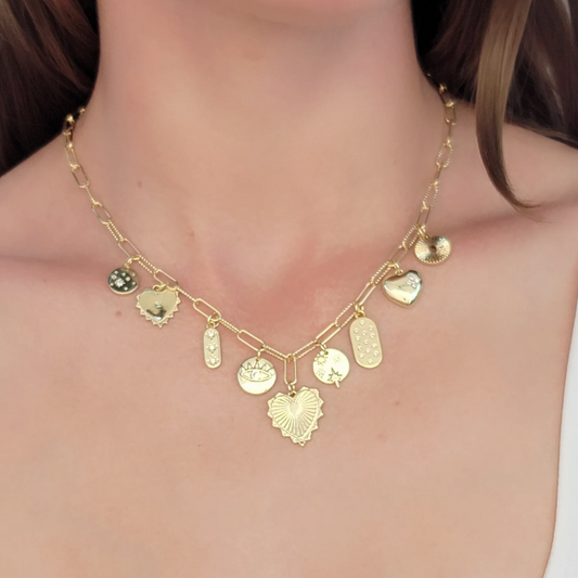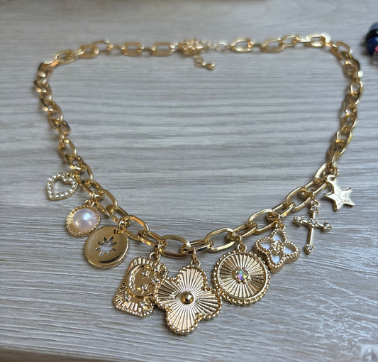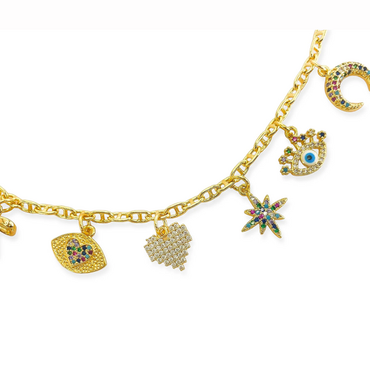 Charm necklace with star, horseshoe, evil eye and black cresent moon charm