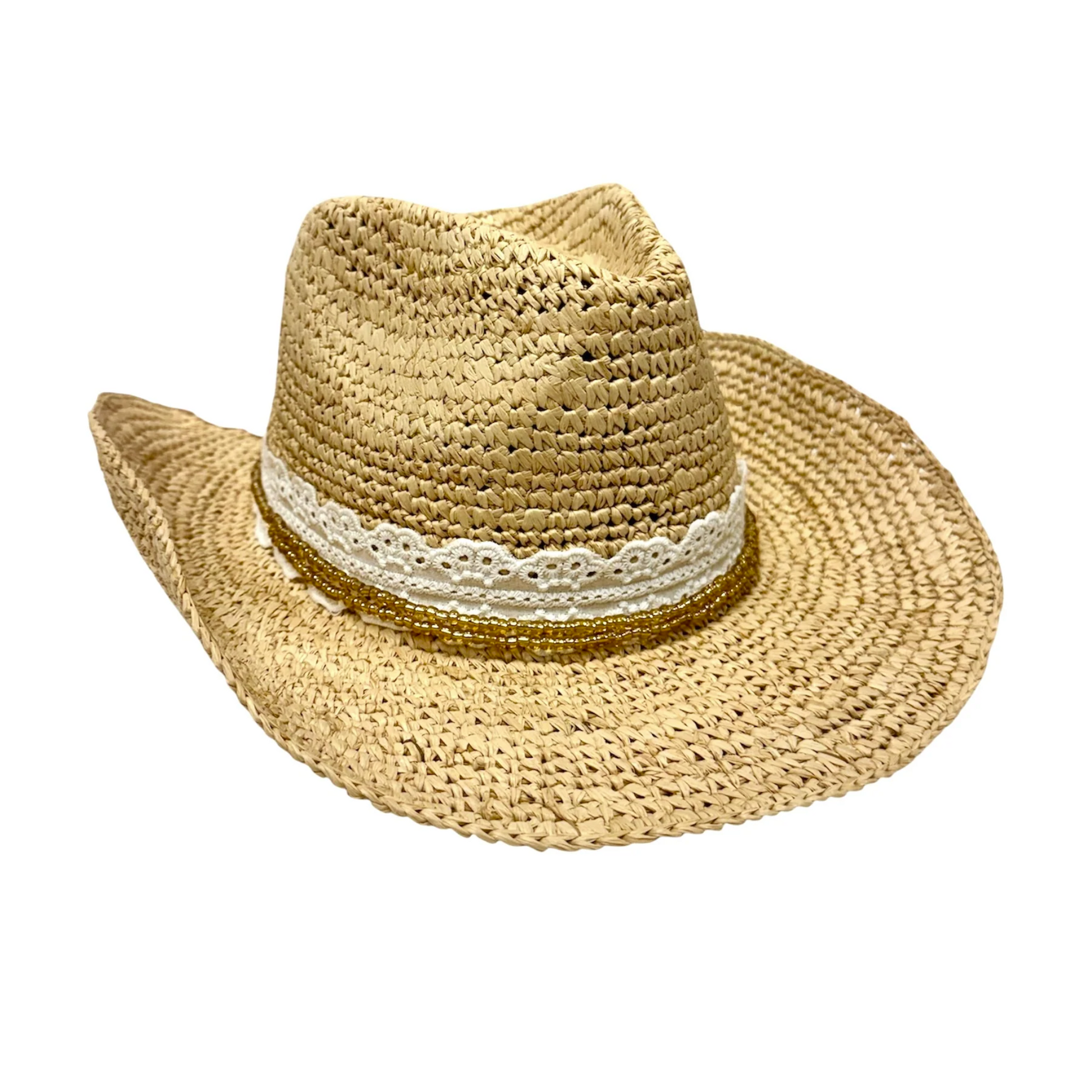 Introducing the Nashville Cowboy Straw Hat! Hand-crafted with love and adorned with eyelet band and hand strung beads, it's perfect for beach days, vacations, or any sunny adventure! Yee-haw!