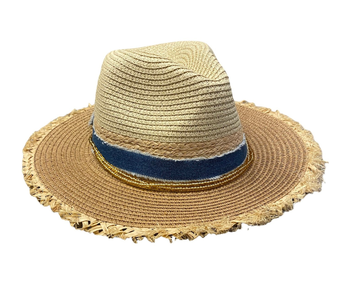 1Amagansett/Frayed Two-Tone Sand Straw/Dark Denim Band/Gold Beads